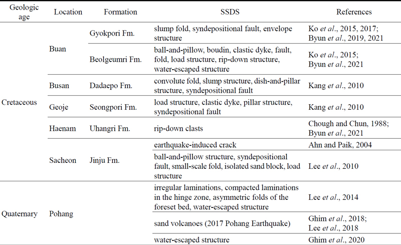 현재까지 국내에서 연구된 지진성 SSDS(표 1) 연구의 대부분은 중생대 백악기의 경상분지와 백악기 소분지에서 이루어졌다. 이에 비해 제4기 지층의 연질퇴적변형구조는 전반적으로 부족한 상황이다. 2017 포항지진 당시 액상화에 의해 발달한 모래화산(sand volcanoes)(Ghim et al., 2018; Lee et al., 2018)과 포항지역에 발달하는 해안단구에서 발달한 말린엽층리(convoluted lamination)와 물빠짐 구조(water-escaped structres)가 연구된 바 있으며(Lee et al., 2014; Ghim et al., 2020), 일부 트렌치 조사에서 지표파열과 함께 보고되기도 하였다(e.g., Cheon et al., 2020; Song et al., 2020; Kim et al., 2022).