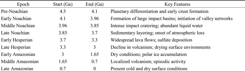 가장 오래된 화성 운석은 약 41억 년 전의 ALH 84001로 초기 노아키스기를 대표한다(Borg et al., 1999; Nyquist et al., 2001; Righter, 2025). 나클라이트와 샤시그나이트는 약 13억 년 전(아마조니스기 중기)에 형성되었으며, 가장 젊은 셔고타이트는 약 1억 5천만~2억 년 전(아마조니스기 후기)에 형성되었다. 일부 용암은 충돌구 연대 측정에 따르면 1억 년 미만일 가능성도 있다(Hartmann and Neukum, 2001). 이는 화성이 형성된 이후에도 화성 활동을 멈추지 않았고, 비교적 최근까지 화성 활동이 간헐적으로 지속되었음을 보여준다. 그러나 약 41억 년에서 24억 년 사이(헤스페리아기)의 연대를 가진 운석은 존재하지 않는다(그림 2). 이 시기에 화성이 실제로 마그마 활동의 침체기를 겪었는지, 아니면 단순히 그 시기의 암석이 화성에서 방출되지 않았거나, 약 30억년 전 이후의 화산 활동들에 의해 생긴 새로운 지각에 의해 뒤덮였는지는 불분명하다(Udry et al., 2025).