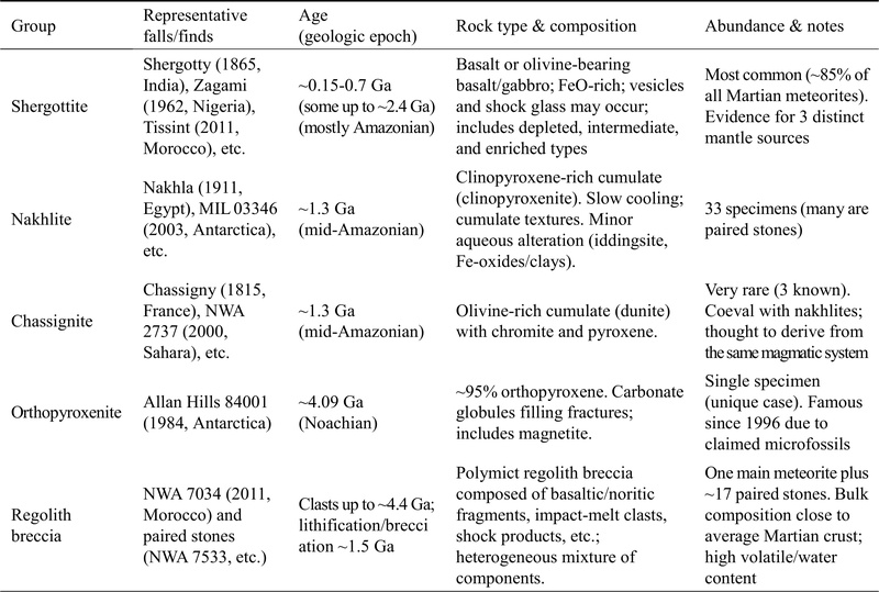 화성 운석은 여러 화학적·동위원소적 기준에 따라 화성에서 유래한 암석으로 정의된다(3장에서 상세히 다룸). 역사적으로 SNC 운석(shergottite, nakhlite, chassignite)이라 지칭했던 운석들은 한때 소행성 기원의 운석으로 잘못 분류되었으나, 이례적으로 젊은 생성 연대, 화성 조직(igneous texture), 그리고 독특한 광물 조합(고압 광물상, 수성 변질 광물 등)으로 인해 행성 기원일 가능성이 제기되었다(McSween and Stolper, 1980). 결정적인 증거는 충격으로 생성된 유리(glass) 속에 갇힌 기체가 화성 대기와 일치한다는 사실에서 나왔다. 1979년 남극에서 발견된 운석 EETA 79001의 충격 용융 유리에서 바이킹 착륙선이 측정한 화성 대기와 동일한 조성의 기체가 검출되면서, SNC 운석이 화성에서 왔음이 확인되었다(Bogard and Johnson, 1983). 대표적인 화성 운석들로는 셔고타이트(shergottite), 나클라이트(nakhlite), 샤시그나이트(chassignite) 그룹과 사방휘석암(orthopyroxenite)인 Allan Hills (ALH) 84001, 다양한 기원의 암편이 혼합된 다성분 표토 각력암인 NWA 7034가 있다(표 2).