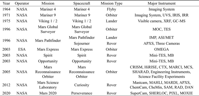 NASA의 Mariner 4 임무는 최초로 화성 플라이바이(flyby)에 성공하여 근접 촬영 사진을 획득함으로써 화성 탐사의 새로운 장을 열었다(Leighton et al., 1965). 이어서 1971년 소련의 Mars 2 궤도선(orbiter)이 최초로 화성 궤도 진입에 성공하였으며, 1975년에 발사된 NASA의 Viking 1호는 화성 표면에 안착한 최초의 착륙선(lander)으로 화성의 토양 및 대기 분석을 수행하였다(Soffen and Snyder, 1976). 이후 1996년 Mars Pathfinder 임무에서는 최초의 로봇 탐사선(rover) Sojourner가 화성 표면을 주행하며 지표 환경에 대한 현장 조사를 수행하였다.