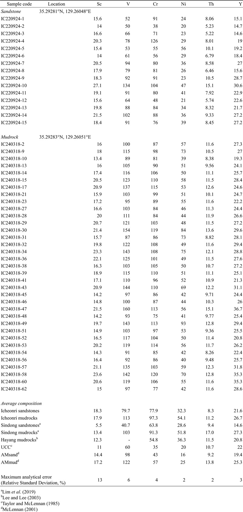 부산 기장군 신평리 해안가 일대에 노출된 이천리층에서 15개의 사암과 35개의 이질암을 채취하였다. 사암 및 이질암의 미량원소 함량은 캐나다 ALS Geochemistry에서 수행되었다. 미량원소(Sc, V, Cr, Th, Y)의 함량 분석은 시료를 리튬 보로산염(Li2B4O7)로 융합(fusion)한 후 완전 용해하여 유도결합플라즈마 질량분석기(Inductively Coupled Plasma-Mass Spectrometer; ICP-MS)로 분석하였다. Ni의 함량은 시료를 염산(HCl), 질산(HNO3), 불산(HF), 과염소산(HClO4)의 혼합산으로 완전 분해한 후 유도결합플라즈마 방출분광기(Inductively Coupled Plasma Atomic Emission Spectroscopy; ICP-AES)를 이용하여 분석하였다. 표준물질에 대한 분석 결과, 회수율은 대체로 0.2-8% 범위로 나타났으며, 복수의 표준물질을 반복 분석한 결과, 최대 오차범위는 상대표준편차(Relative Standard Deviation)를 기준으로 2-13% 수준으로 확인되었다(표 1). 경상누층군 신동층군과 하양층군의 미량원소 분석 자료는 선행연구에서 보고된 자료를 종합하였는데, 신동층군 사암 및 이질암의 조성은 Lee and Lee (2003)Lim et al. (2019), 하양층군 이질암의 조성은 Lee and Lee (2003) 자료를 이용하였다.