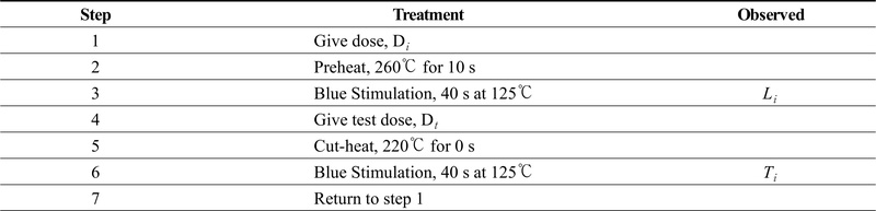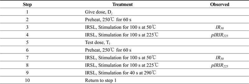 등가선량(equivalent dose)은 단일 시료 재현법(Single-Aliquot Regenerative-Dose protocol; SAR protocol)을 이용해 측정하였으며, 실험 조건은 표 1, 2와 같다. 등가선량의 측정 장비는 한국기초과학지원연구원(Korea Basic Science Institute; KBSI)의 OSL/TL 장비(Risø TL/OSL-DA-20)를 이용하였다. 여기광원은 다입자 시료를 분석하기 위한 blue LEDs (470 nm, ~80 mW/cm2), IR LEDs (875 nm, ~135 mW/cm2)를 사용하였으며, 시료의 방사선 조사(irradiation)는 측정 장비에 부착된 90Sr/90Y 베타선원을 이용하였다. 루미네선스 신호는 광전자 증폭관(photomultiplier tube; PM-Tube)을 통해 측정되었다. 석영 OSL 연대 측정에는 7.5 mm Hoya U-340 필터를 통과한 자외선 영역의 신호가 이용되었다. K-장석 IRSL 연대 측정에는 blue filter pack (4 mm Corning 7-59와 2 mm Schott BG 39)을 통과한 청색 파장 영역의 신호가 이용되었다.