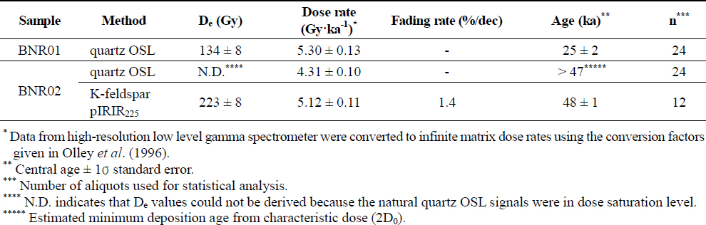 BNR01 (Unit A)의 석영 OSL 연대 측정 결과는 25 ± 2 ka로 계산되었다. 석영 OSL 연대 측정을 통해 도출된 BNR02 (Unit B)의 퇴적 연대 하한은 > 47 ka, K-장석 IRSL 연대 측정 결과는 48 ± 1 ka로 계산되었다(표 3).