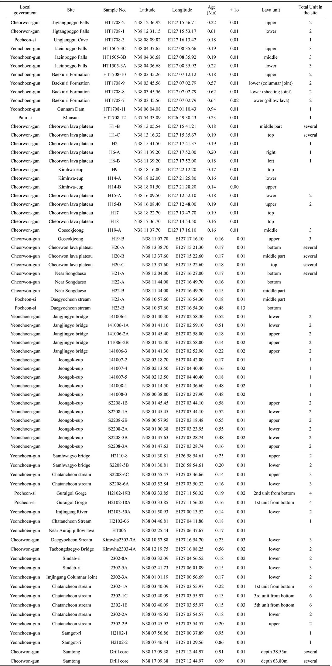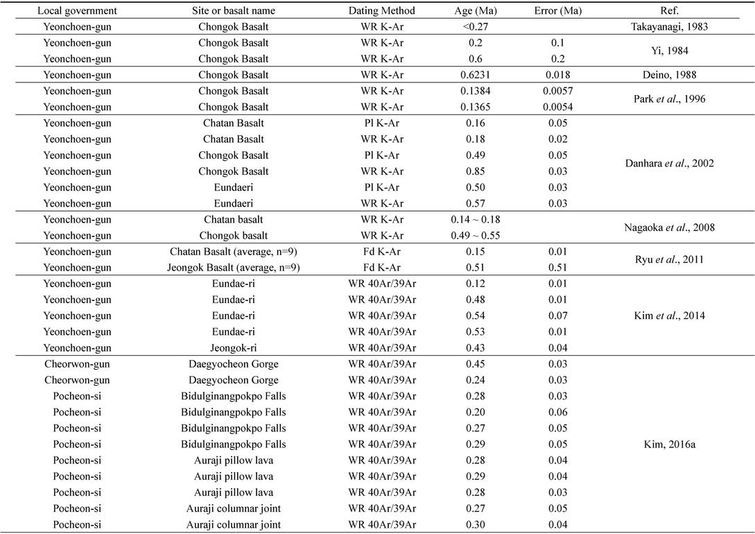 Age data of Hantangang Basalt (Samgot Basalt, Jeongok Basalt, Cheorwon Basalt) in this study. Dating method is only whole rock 40Ar/39Ar.