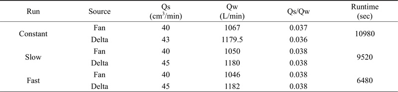 퇴적 단면에서 보여지는 두께(Zc)를 사용하여 삼각주 상부 경사도를 예측하였다(표 2). 해수면 변동이 없는 일정한 해수면 실험과 느린 해수면 변동 실험에서는 근원부와 말단부의 경사(St)가 각각 0.15와 0.17 및 0.20과 0.27로 서로 유사하게 유지되었으며, 이는 해수면이 정지되어 있는 조건이나 해수면의 변동이 분지의 평형시간보다 느린 변화 조건이었을 때, 시스템이 안정적으로 충진된다는 이론적인 퇴적 양상과 부합한다(Muto and Steel, 2002). 두 실험에서 공통적으로 관찰된 근원부 대비 말단부의 가파른 경사는 삼각주 하류 방향으로 위로 볼록한(convex-up) 형태를 띠고 있음을 잘 보여준다. 이러한 퇴적 양상은 삼각주가 전진 퇴적보다 상대적으로 상향 퇴적이 우세하게 일어났음을 의미하며, 이는 해수면이 정체되거나 매우 느리게 변화하는 환경에서 삼각주가 충분한 시간을 갖고 안정적으로 발달했음을 반영하는 중요한 근거가 될 수 있다.