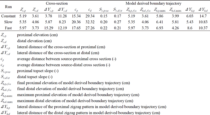 선상지-삼각주 경계의 측면 이동 규모를 계산한 결과, 모든 실험에서 근원부보다 말단부에서 선상지-삼각주 경계의 좌우 이동 규모가 더 크게 나타났으며 그 차이는 해수면 변동 속도가 빠를수록 줄어들었다(그림 7).