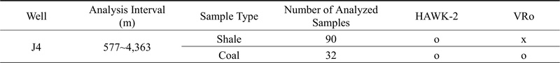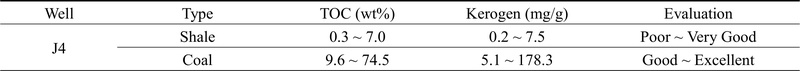 시추공 J4에서 획득된 시료는 층서적으로 플라이오세, 마이오세, 후기 및 전기 올리고세 퇴적층으로 구분되며, 암상은 주로 이암과 석탄으로 구성된다. 본 연구에서는 각 구간에 대해 TOC, 케로젠 함량, Tmax, HI, OI 이용한 열분해 분석 결과를 정리하였다(그림 2).