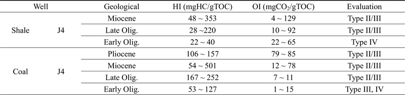 시추공 J4에서 확보된 이암과 석탄 시료의 HI와 OI 값은 층서 구간 및 암상에 따라 서로 다른 분포를 보인다. 마이오세 이암의 HI는 48∼353 mgHC/gTOC, OI는 4∼129 mgCO2/gTOC 범위에 분포한다. 후기 올리고세 이암의 HI는 28∼220 mgHC/gTOC, OI는 10∼92 mgCO2/gTOC 범위로 측정되었고, 전기 올리고세 이암의 HI는 22∼40 mgHC/gTOC, OI는 22∼65 mgCO2/gTOC 범위에 분포한다. 석탄 시료의 HI는 이암에 비해 상대적으로 넓은 분포 범위를 보인다. 마이오세 석탄의 HI는 54∼501 mgHC/gTOC, OI는 12∼78 mgCO2/gTOC 범위에 분포한다. 후기 올리고세 석탄의 경우 HI는 167∼252 mgHC/gTOC, OI는 7∼11 mgCO2/gTOC 범위로 측정되었고, 전기 올리고세 석탄의 HI는 53∼127 mgHC/gTOC, OI는 1∼15 mgCO2/gTOC 범위에 분포한다.