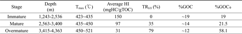 산정된 TR을 현재 관측된 %GOC에 적용하여 심도별 초기 생성가능 유기탄소 비율(%GOC₀)을 다음 식으로 역산하였다.