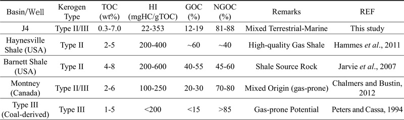 Comparison of source rock characteristics from Well J4 with global shale plays and Type III coal-derived basins.
